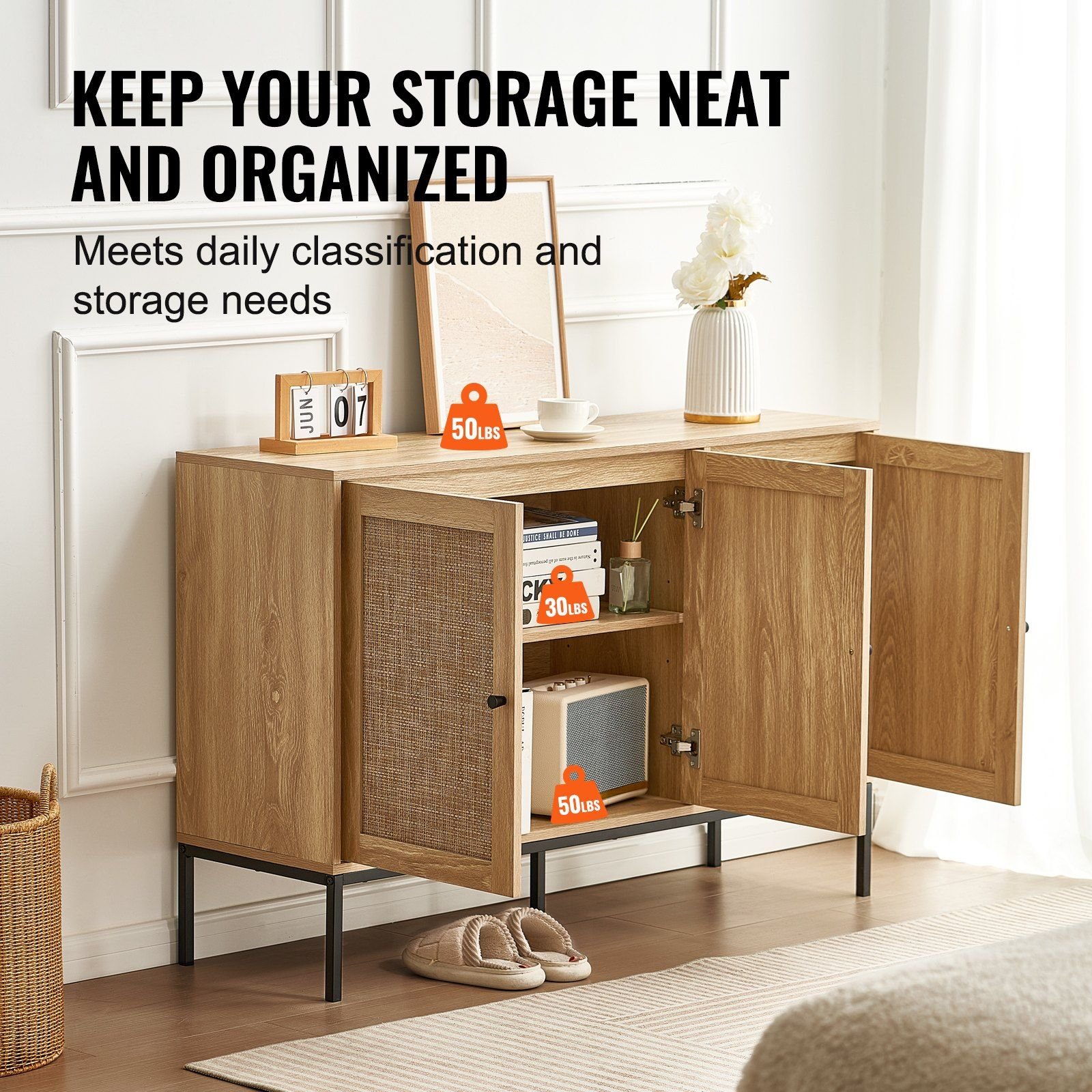 This rattan buffet cabinet offers the perfect storage solution, suitable for use as a kitchen sideboard, bar cabinet, storage unit, or entryway shoe cabinet. Its versatile design makes it adaptable to various settings, serving as both a storage unit and a decorative piece.