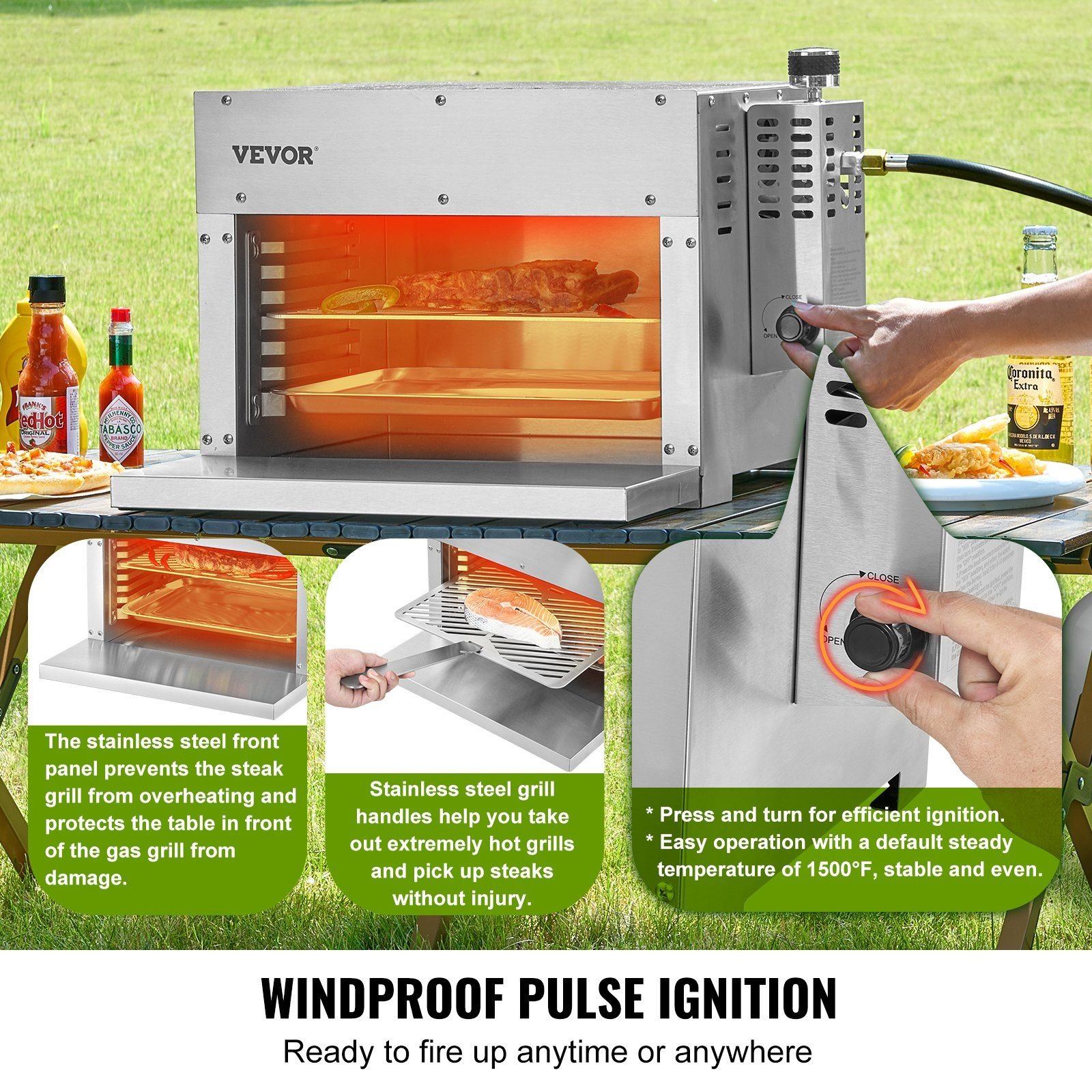 The gas steak grill preheats to 1500°F in just 5 minutes, faster than a conventional oven, making it simple to achieve chef-quality sear.
